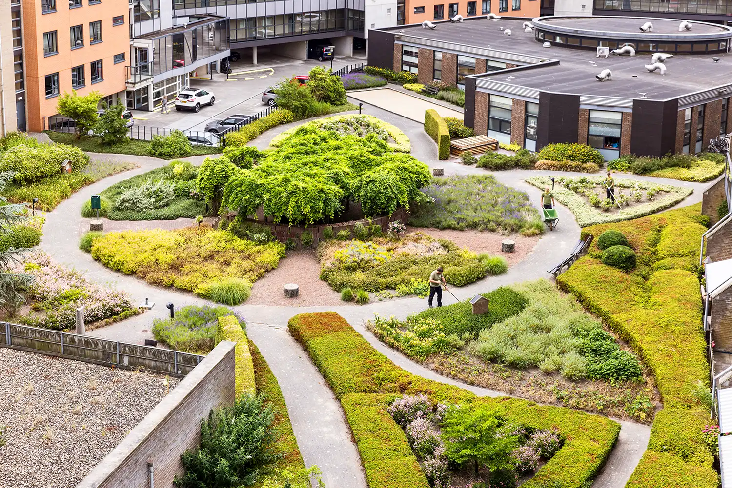 “Het Levende Gebouw” is een initiatief van Branchevereniging Koninklijke VHG dat pleit voor de integratie van groen in gebouwen, inclusief groene daken, gevels, interieurs en binnentuinen. Het richt zich op trends, ontwikkelingen en uitdagingen in de groene sector, met nadruk op multidisciplinaire samenwerking tussen hoveniers, architecten, ecologen en bouwbedrijven. Het doel is om gebouwen te transformeren tot levende ecosystemen die bijdragen aan biodiversiteit, hitte-reductie en waterbeheer. Bij Weverling passen we dit toe in projecten waar groen niet alleen decoratief is, maar functioneel bijdraagt aan duurzame stedelijke ontwikkeling.