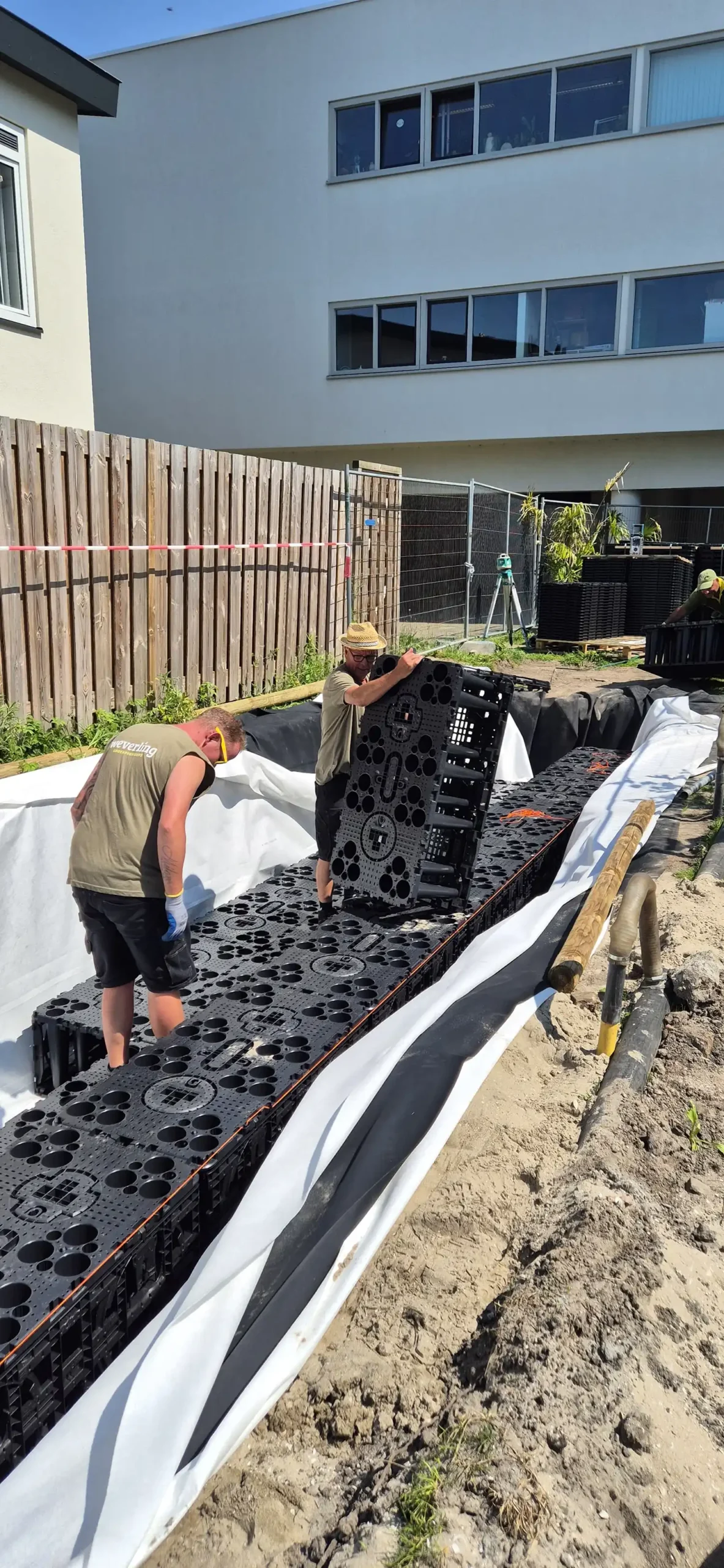 Infiltratiekratten: Kunststof modules met een grote holle ruimte die onder de verharding worden geplaatst om piekbuien op te vangen.